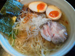 会社の後輩のおじいちゃんがやっているお店。 姉貴と母は前に一回来たことがあるそうで、今回は自分も行ってみました。 有名店なので、店の前には長蛇の列。 こりゃーだいぶ時間がかかるなぁーと思いながら 行列の最高尾に向かって歩いていたら、 最後尾になんと会社のその後輩が。 なかなかのどっきり。 こんな偶然あるんだねーってお互い思いながら、 店に入るまで、後輩とそのお母さんから この店の話(こだわり)などを伺いました。 一時間半ほど待って、やっと入店です。 店内はレトロな置物もありつつ 落ち着いた雰囲気になってます。 テーブルの配置も広くとってありますね。 このくらいの人気店だと、回転率等を意識して なるべく席は多くとりがちなんですが、 お客さんのことを考えた結果なのでしょう。 お店のこだわりが店内に入っただけでも感じられます。 塩+味玉 ¥800+100 塩と醤油のみで勝負してます。塩は焼きアゴ、醤油は焼きアジと、 スープのベースまで変えてるこだわり様。 揚げた小エビ、唐辛子がともすれば物足りなさを感じるスープに インパクトを与えてます。 キクラゲはすごい歯ごたえ。 そんでメンマはどストライクの仕上がり。色もつけずに良く味がついてる。 # 流石後輩が一押しするだけのことはあります。 県内屈指という評判は伊達じゃないですね。 大変おいしゅうございました。 --- http://ramendb.supleks.jp/s/7137.html |