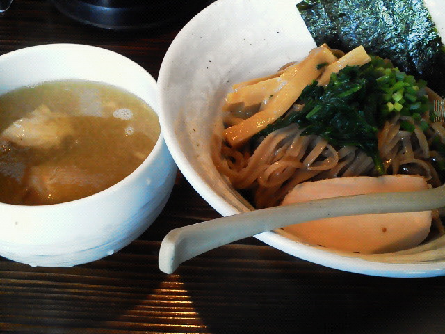 G麺7の別ブランド店。 カウンター7席と2人がけのテーブルが1つのみと こじんまりした店。 厨房も動きにくそうです。 ザ・塩つけ麺(中盛) ¥880 券売機で値段を見た限りではちょっと高いかなーと思ってたんですけど、 こうして出てきたラーメンを見ると、まずまずかなとも思います。 麺は蕎麦のような平打ち角のストレート。 強烈なコシがないのがちと残念。 つけ汁はサラサラっとしてて麺との絡みはあまりありません。 なので、ちょっと味は薄い気もしますが、 スープをそのまま飲むとこれは塩辛い。 ちょっとバランス悪いかなー。 つけ汁の中に浮かんでるトロトロのチャーシュー、鶏ハム、極太メンマと 具の出来は秀逸。 うーーーん、ちょっと僕の好きなつけ麺とはかけ離れてますね。 --- http://ramendb.supleks.jp/s/54403.html |
