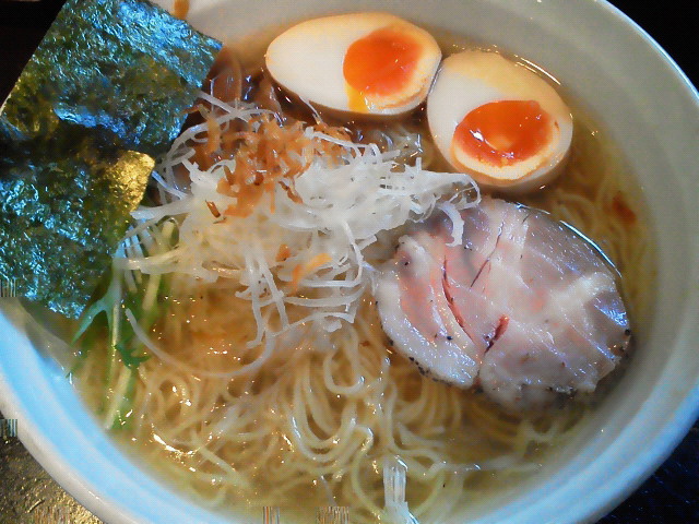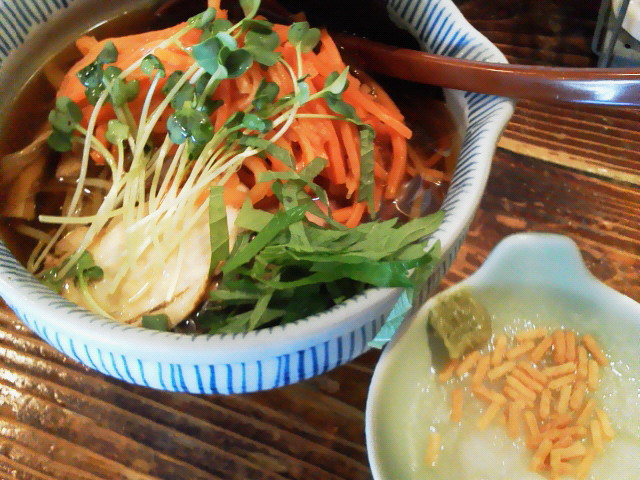 こんな暑い日はラーメン。 冷やし夏そば ¥900 キンキンに冷えて〆られた麺が抜群に美味い。 上に乗っているのは人参の細切り、貝割れに大葉。 ラーメンに人参っていうのは珍しいですね。 スープは酸味がちょっと入ってます。 昔の冷やし中華のタレの雰囲気をかすかに感じますね。 で、お好みで大根おろしとあられを追加すると、 冷やし茶漬けのような感じになって、雰囲気がちょっと変わります。 ま、コスパはいまいちだと思いますですが、夏限定のイベントものなのでね。 今年はスタンプラリー制覇はできないな。残念。 --- http://ramendb.supleks.jp/s/18531.html |