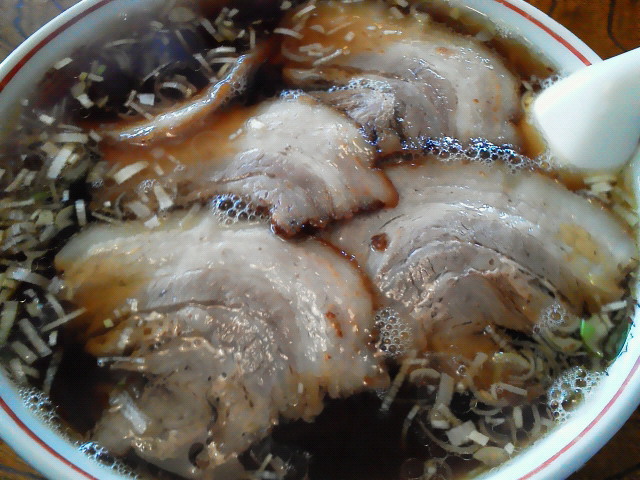 今年最初の一杯は、地元の人が足繁く通う、 昼間の数時間しか営業していないこのお店。 メニューはラーメンとチャーシュー麺のみというこだわり。 ラーメン大 ¥700 チャーシュー麺かと見まがうくらいの見た目。 具は刻んだ葱とこれでもかというくらい並べられたチャーシューのみ。 なんとまあ潔い。 寒い地域独特の、煮干のしっかり効いた甘い醤油色の強いスープ。 こういうスープは飲んだ時に安心感に浸れるのがいいですね。 麺とスープのバランスが悪くなるくらい並々とスープを 注がれてるんですが、スープを沢山飲んで欲しいんでしょうねぇ。 麺は中細。かなりの柔らかさです。 ただ多加水なんで、最後まで柔らかさはキープしてました。 この柔らかさは年寄りへの配慮? 具のチャーシューは薄切りですが、トロトロの柔らかさで 麺との一体感もちょっと感じられました。 こういうチャーシュー家でも作ってみてーなー。 --- http://ramendb.supleks.jp/s/11040.html PR |