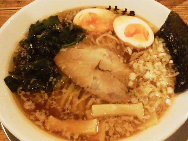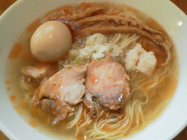 味玉醤油 ¥780 おぉっ!? 鰹ベースの和風スープにすごい甘みが加わってます。 背脂が適度に浮いていて超美味い。 ウェーブのかかった太麺もスープと絡んで美味い。 具はワカメ以外はちょっと微妙でしたが、 基本のスープと麺は結構レベル高いと思います。 --- http://ramendb.supleks.jp/shop/4974 |