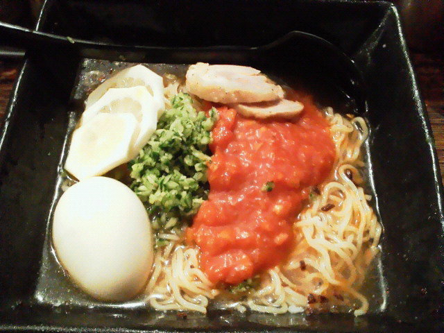 夏そば + 大盛り ¥850 大盛り無料なのはうれしいが、ここまで大盛りだと具と麺のバランスが悪い。 みじん切りの胡瓜とトマトのペースト、味玉に鶏のチャーシュー。 そしてなぜか皮の剥かれたレモン。 # 農薬たっぷりだから? 麺もよくしまっていて、ちょっと粘度のあるタレと表面の脂がよく絡んで美味い。 ただ見て分かるとおり、ラーメンとして美味いかというと、それは微妙。 期間限定ラーメンって、なーんか試行錯誤で ちょっといい感じになったから出したっての多くね? --- http://ramendb.supleks.jp/shop/1410 |