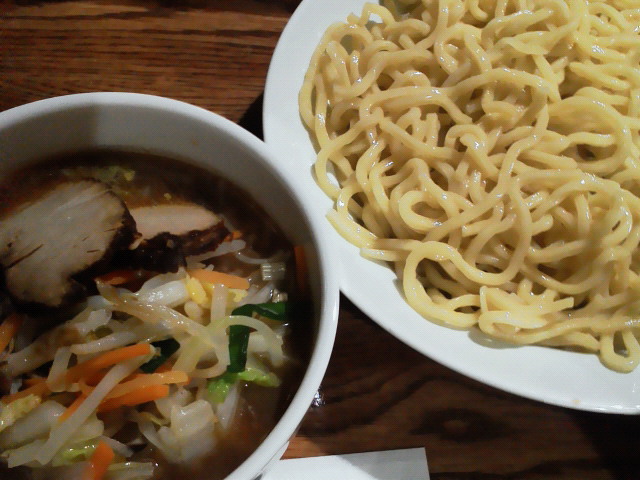 メニューの写真を見ると、普通のラーメン屋でも通用しそうなくらい美味そう。 醤油野菜つけ麺大盛り ¥790 つけ麺で野菜がこれだけ入ってるっていうのは珍しい。 麺は太麺と平麺が選べて、大盛りは無料。 麺のコシはちゃんとあるし、美味しい。 少々辛味の強いつけ汁が食欲をそそります。 チャーシューは今二つくらいだけど、それ以外はなかなかです。 --- http://ramendb.supleks.jp/s/26824.html |