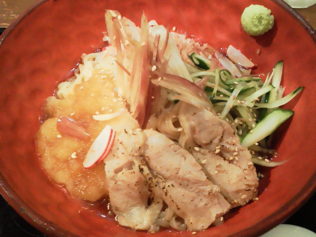 和風冷やし鶏そば ¥680 ふむ。大根おろし、胡瓜、茗荷、鰹節、で炙った鶏のチャーシューですか。 麺は平打ち。太さ、食感的に稲庭うどんに似てますね。 スープは和風な感じです。 うむ、冷たい蕎麦の麺をラーメンにしたという表現がしっくりくる。 --- http://ramendb.supleks.jp/s/4422.html |