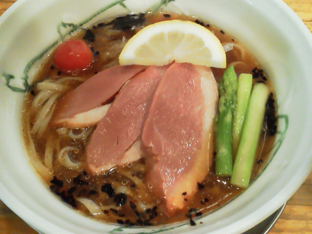 SEXY DUCK カモスモークの冷やしラーメン カレーペースト ¥950 やはりG麺7とのコラボ。丼もG麺のものだし。 焦がし葱が浮いた鶏と鰹の和風冷製スープに全粒粉の平麺。 具はカモとアスパラとトマト。 トマトがすげー甘くていい口直しになりました。 --- http://ramendb.supleks.jp/s/2557.html PR |