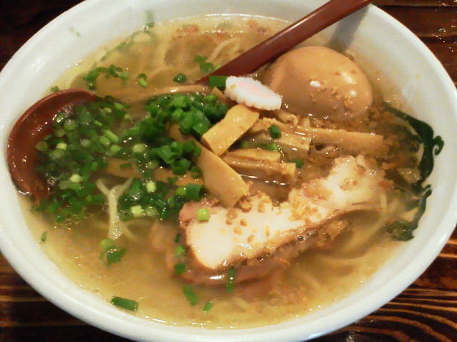 味玉塩ラーメン+大盛り ¥850 + 50 麺は細め多加水のストレート。モチモチしてて美味い。 透明感のあるスープは上に乗せてるあぶらかすみたいなやつで コクと深みが一層と出てます。 が、大盛りにしてスープも多くなったせいか、 飲み干すにはちょっと塩味がキツイですね。 無化調なはずなんですが、なんか人工的な味を感じたのは 塩のミネラルのせい? 炙った薄切りの豚のチャーシューが2切れ 鶏チャーシューが1切れ メンマ 味玉 と、具への手間隙のかけ方は申し分ないっす。(今回は味玉がちょっと柔らかすぎましたかね) 上大岡には少なくともあと2回は来るから、2回はこの店に来るのかな。 --- http://ramendb.supleks.jp/shop/18531 |