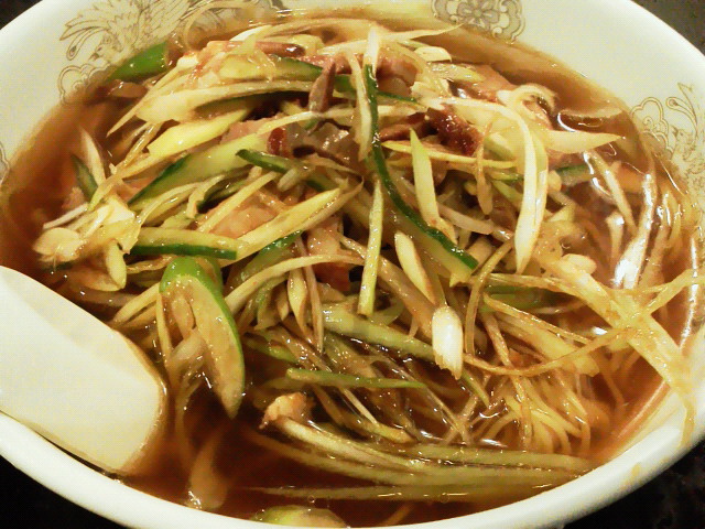 ねぎチャーシュー麺 ¥値段忘れた 一緒に食べに行く先輩が、最近毎週これ頼んでるので、僕も乗っかってみました。 化調丸出しだし、麺もちょっと・・・、なんですが、 上に乗せてる葱と胡瓜とチャーシューの細切りは美味いです。 これが麺とスープとよく絡むから、結果として美味く感じると。 --- 神奈川県横浜市西区南幸2-1 |