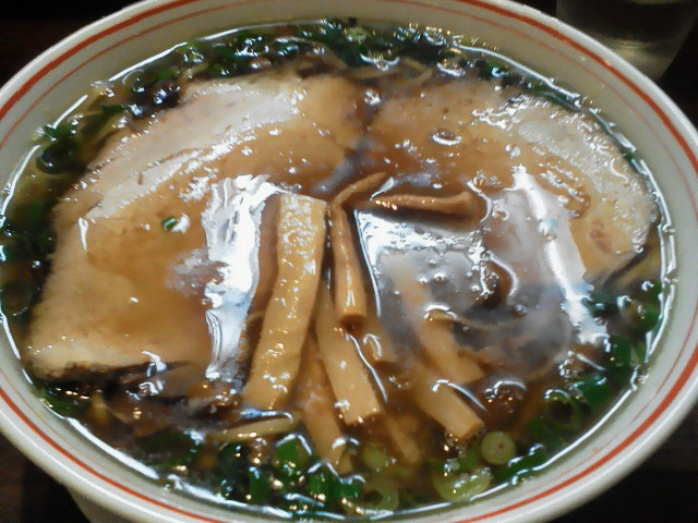 きっと僕が日本を離れてた間に出来たんでしょう。 昼は太麺、夜は細麺を出す店のようです。 醤油ラーメン ¥650 華やかさは無いものの、絶対美味いっつーのが見ただけで分かる。 甘く濃い醤油のタレに魚介の香り、旨みが強く出てるスープが合いますねぇ。 鶏の旨みも忘れてしまうほど魚介の印象が強いですね。 鶏油が浮いてていつまでもアツアツです。 超美味い。 麺は低加水のパッツパッツ。 好み。 チャーシューは中華料理屋でよく見る、回りがピンクになってるタイプですね。 ハチミツつけてるやつだ。 と思って食ってみたんですが、仕上がりはラーメン屋のチャーシューになってる。 驚き。 メンマは決して太くはないんですが、歯ごたえがあって、これまた僕の好きなタイプのやつです。 味がわざと薄めなのは狙いかな。 というわけで結構満足の一杯でした。 昼も行ってみよー。 --- http://ramendb.supleks.jp/shop/29917 |