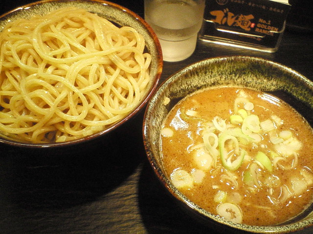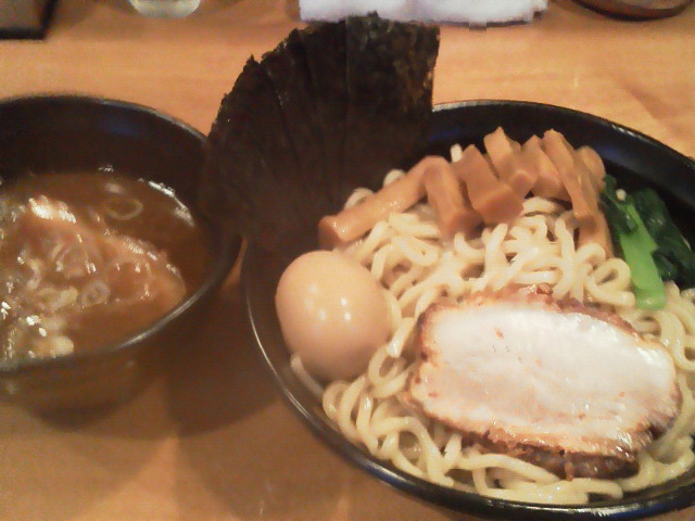特製+特盛り ¥1050+200 うーん。ぶれぶれだな。。。 腹減って死にそうだったので、細かく分析する気は全然・・・。 でも肉厚の柔らかいチャーシューがすげー美味かった。 脂が多すぎるわけでもなく、肉がパサついてるわけでもないんですが、 肉肉しさがすごい。食べ応えがあります。 極太の柔らかメンマ、味玉、海苔、小松菜?と脇も贅沢に固められております。 スープは魚の香り・味ともに存分に出てます。 豚骨魚介スープらしいんですが、豚骨な感じはあまりしません。 他の店よりの魚粉は細かめです。 この魚粉の細かさ・量でスープの粘度が変わったりするんですが、 ここの店のスープはつけ麺にしてはサラサラ系です。 なので麺との絡みはもう一つ、という感じかなぁ。 胃も心も満たされ相当満足でした。 欲を言えば温度かな。もうちょっとスープ熱くして、温くならないようにしてもらえれば・・・。 --- http://ramendb.supleks.jp/shop/23257 |