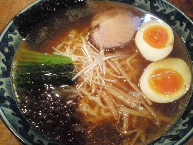一ヶ月ほど前、この店来てつけ麺を食ったんですが、 絶対普通のラーメンの方が美味いと確信を持ったので再訪。 醤油+大盛り+味玉 ¥650+100+100 ・・・ほらぁ~、もう見ただけで分かるじゃないですか、美味いの。 スープはあっさりとした魚介+鶏ですかね。 味は言うことないし、バランスが良いのでクドさもなく、いくらでも飲めますな。 麺はウェーブの強いシコシコの中太の平麺。 これまた文句なし。 大盛りを頼んだんで、麺とスープの量のバランスがちょっと崩れてて、 スープの方が結構多い。まあ、いくらでも飲めるので問題無いんですが。 チャーシューはジューシューさがあまりないですが、肉の旨味はしっかりと感じとれます。 メンマは細切りなんですが、存在感があんまりないかな。 せっかく美味しいメンマを作れる店なので、むしろ極太にした方がいいような。 玉子はしっかりと味がついているんですが、食感がすごく柔らかいのが 他の店のとは大きく違う気がします。 半々熟、半熟とかそういう火の通し方ではなく、 それとはまた違った工夫で、柔らかさを出しているような(と勝手な妄想)。 うん、やはり間違いなく普通のラーメンの方が美味い。 相鉄沿線(横浜・海老名除く)では一番美味い醤油ラーメンだと思いますよ、これはマジで。 --- http://ramendb.supleks.jp/shop/4865 |