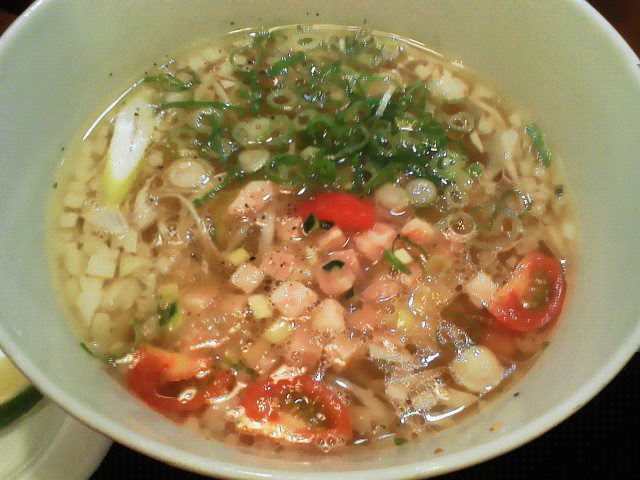 ベーコンとズッキーニの洋風コンソメらぁ麺 ¥750 コンソメ仕立てというより、もうほんとにコンソメです。 火傷しそうな位熱くなってるので、飲むときは注意しましょう。 スープだけを啜るとまったくはラーメンな感じはしないのですが、 麺を啜るとそのスープは程よく、表面の脂がしっかりと絡んで、 たちまちラーメンな感じになります。 こりゃー面白い。 チャーシュー、メンマとかラーメンらしい具は全く入っていないんですが、 麺とスープだけで十分勝負できる味だと思います。 期間限定モノなんですけど、なんかよく計算されているラーメンだなぁと思いました。 --- http://ramendb.supleks.jp/shop/4422 |