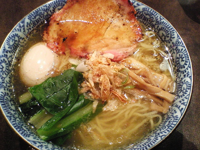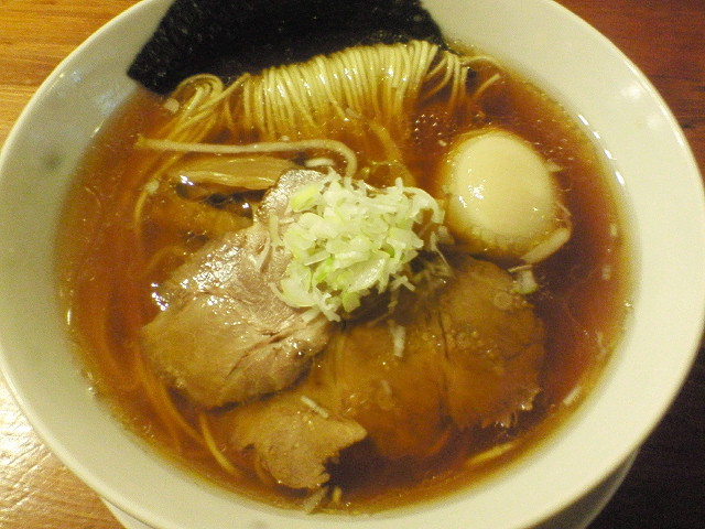 味玉らーめん(醤油) ¥830 ちっちゃーな器にこじんまりと綺麗に盛り付けが。 麺は中細でゆるめのウェーブ。一般的、普通な感じの麺ですが、腰は最後まで持ってました。 スープは何か旨みが特出してるわけでもなく、尖った味でもなく飲みやすい。 揚げエシャロットのせいか、油が若干多め。 チャーシューは炙ってます。でも柔らかく、そしてなにより旨みが強い。 側が赤くなってますが、中華で使うチャーシューのような仕込みでもしてるんでしょうか。 味玉も柔らかく、美味い。 全体的に見てものすごくレベルも完成度も高いんですが、 自分的にはあまりはまりませんでした。なんでだろ。 --- http://ramendb.supleks.jp/shop/15702 |