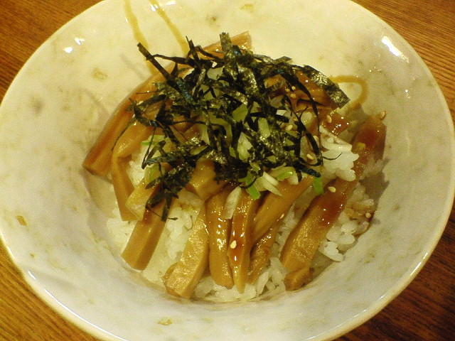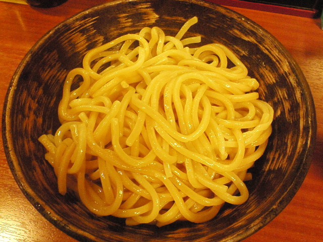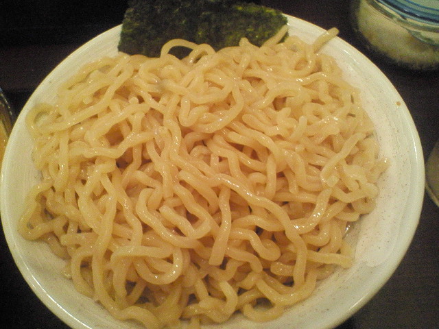 節つけ麺中盛り ¥750 店内に入ると節の香りが。 スープは粘性が結構強いです。 節はよく使われている細かいのではなく、結構荒めです。 チャーシューは薄切りの巻きバラ。 卵は味が若干強め。麺を茹でてる途中でゆで汁の中で一緒に卵を温めてましたが それでも味がボケてない。結構長い間つけダレに漬けてると思われ。 メンマは超太め。でもこれが柔らかくて非常に食べやすい。具の中ではイチバンの出来。 なかなか美味しいと思います。また来てもいいかな。 --- http://ramendb.supleks.jp/shop/16382 |