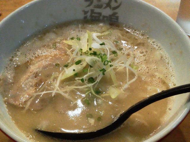 九州に行ってきました。 実はこの店に来るちょっと前に 肉肉うどん+替玉+ごぼ天 で結構腹は膨れてる状態。 ただせっかく博多に来てラーメン食べないのもアレなので、 突入してきました。 今年55杯目です。 魚介豚骨ラーメン ¥700 濃厚でクリーミーな感じの豚骨スープを 魚介でライトに仕上げてる感じですね。 博多・中洲では魚介豚骨で勝負する店は珍しいようですが、 確かに勝負できるくらい美味しいスープでした。 後、自分がちょっと驚いたのは麺ですね。 一風堂や一蘭の麺とは明らかに違う細麺ストレート。 何が違うかというと、粉っぽさが全く無い。 基本長浜系の豚骨ラーメンでは固めを頼むんですが、 一風堂や一蘭のそれは芯が少し残ったポキポキ感がありました。 それが普通なのかなーと思ってはいたのですが、 ここの麺の固めはそれは感じずに、純粋の麺のコシを感じることができました。 うーん、これは腹に余裕があれば替玉でしたね。。。 --- http://ramendb.supleks.jp/s/58957.html |