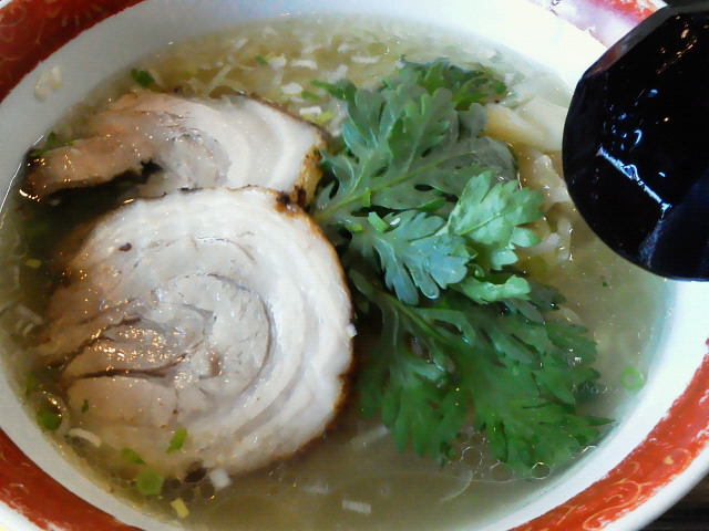 1時間ほど休憩して・・・ 3軒目は本丸亭です。 待ってる間、帯広ナンバーの車が駐車場の場所を 聞いていました。 北海道から食べに来てるとはおどろき。 本丸塩らぁ麺 ¥800 本丸亭といえば、 太さの違う2種類のウェーブがかかった麺、 滋味ある鶏ベースの塩スープ、 脂と肉汁が表面にじわっと浮き出てる綺麗な巻きバラのチャーシュー、 口直し+アクセントにもなる春菊。 ですね。 特に春菊を具につかうという発想と、 チャーシューの完成度は素晴らしいと思います。 ごーちでーしたー。 --- http://ramendb.supleks.jp/s/1238.html |