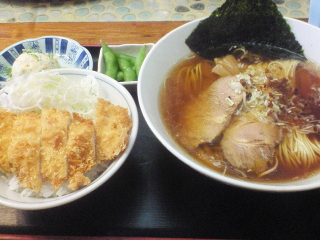 Aランチ ¥880 醤油らーめんと、 若鶏カツ丼と、 ポテトサラダと、 枝豆。 ポテトサラダと枝豆の存在がよく分かりませんが、 これだけのクオリティのものが880円とは安い! たゆまなき味への追求と企業努力ですね。 うん、感動しました。 ---------- 厚木市幸町9-6 [営] 11:00~15:00, 18:00~23:00 [休] 月 |