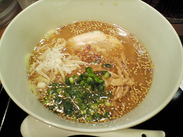 さて、肝心の味はというと、 スープ濃いです。旨味ではなく味が濃い。最初の一口はなんか味噌ラーメンな印象。 でも冷めにくいので、これからの時期には合うかもしれませんね。 麺は細麺ストレート。ですが角がちゃんと残っていて噛み応えが良いです。 具はチャーシューと細めのメンマとネギ、あとはゴマ。 チャーシューは出てきた段階で既にとろとろで、メンマ含めて麺と絡み合って、 一体となってる感じ。こういうの好き。