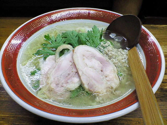 鶏油、塩ダレ、スープ(多分丸鶏)と、使っているのは割と一般的。 鶏と塩だけで勝負してるだけあって、余計なもんは入れてないですけど、 やっぱり変わってると思うのは、春菊なんていうクセのある食材を良く選んでることですね。 でもこの春菊が全体を壊さずにパンチを出していて美味いんだよねぇ・・・。