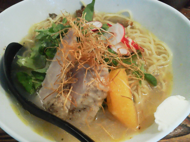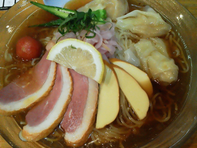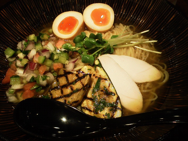 なぜか迷った。 Sexy Duck Smokey Special ¥1200 鴨とスモークチーズとホタテワンタンとシャーベット状のトマト。 真ん中のは梅酢につけた茗荷? 麺は細めのツルツルストレート。冷麺のような、昔の冷やし中華のような。 ふむ。 酸味はレモンとトマトと梅。 茗荷、紫蘇などの和の薬味と、中華、洋の具。 すごい折衷してます。 あと、値段がちとお高い。 ま、夏麺限定だから仕方ないか。 --- http://ramendb.supleks.jp/s/2557.html |