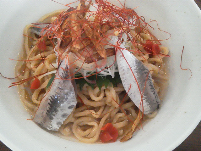 忘れてた2。 今年35杯目。 冷やしにぼしそば ¥950 うん! もちっとしたウェーブの強い太麺が濃厚な煮干のタレとよく絡んでイイ! ちなみに麺は全粒粉のような、そうではないような粒々があります。 具のイワシは下処理なし? 弾力があって新鮮なイワシです。 で、〆は炭酸水に冷たいご飯をぶちこんで冷やし茶漬けだそうで。 これはこれでアリなんですけど、 麺+ご飯を食べると結構なボリュームになります。 うーーーん。ぶっちゃけ冷やし茶漬けは無くてもいいかなぁ。 --- http://ramendb.supleks.jp/s/10808.html |