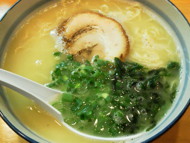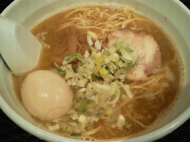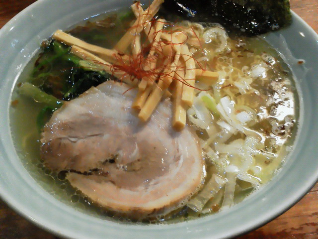 塩ラーメン ¥600 味玉(¥100)は別に出てきました。 おぉ。濃厚な鶏白湯ですね。 目を瞑って飲んだら豚骨スープだと間違えちゃいますね。 麺は細めのゆるっとしたウェーブ。 替玉(¥100)は固めをチョイス。 そしたらほんとに長浜ラーメンみたいな感じになります。 具はシンプルですけど、僕の好きなアオサが入ってるのは嬉しい。 --- http://ramendb.supleks.jp/s/59209.html |